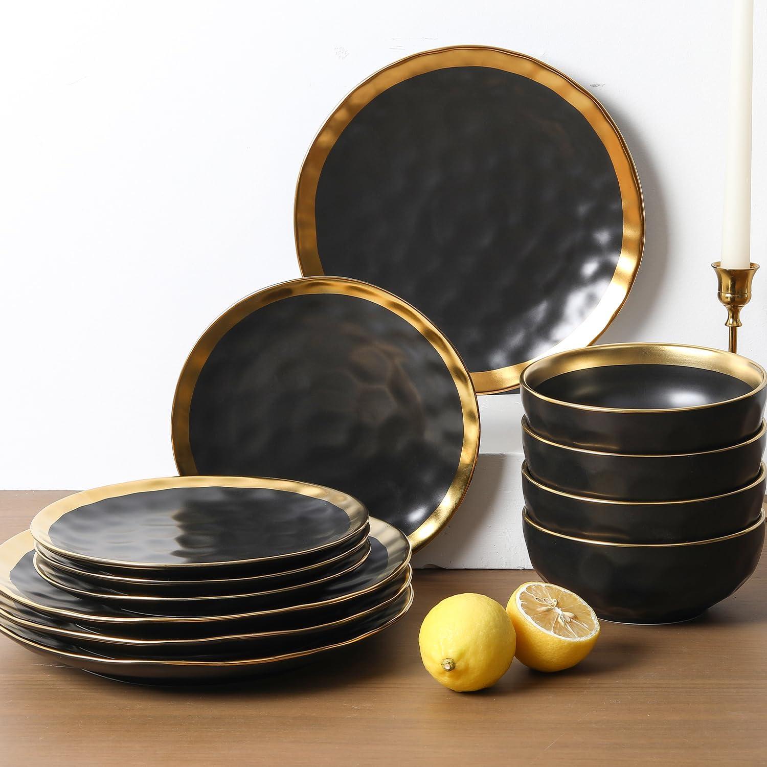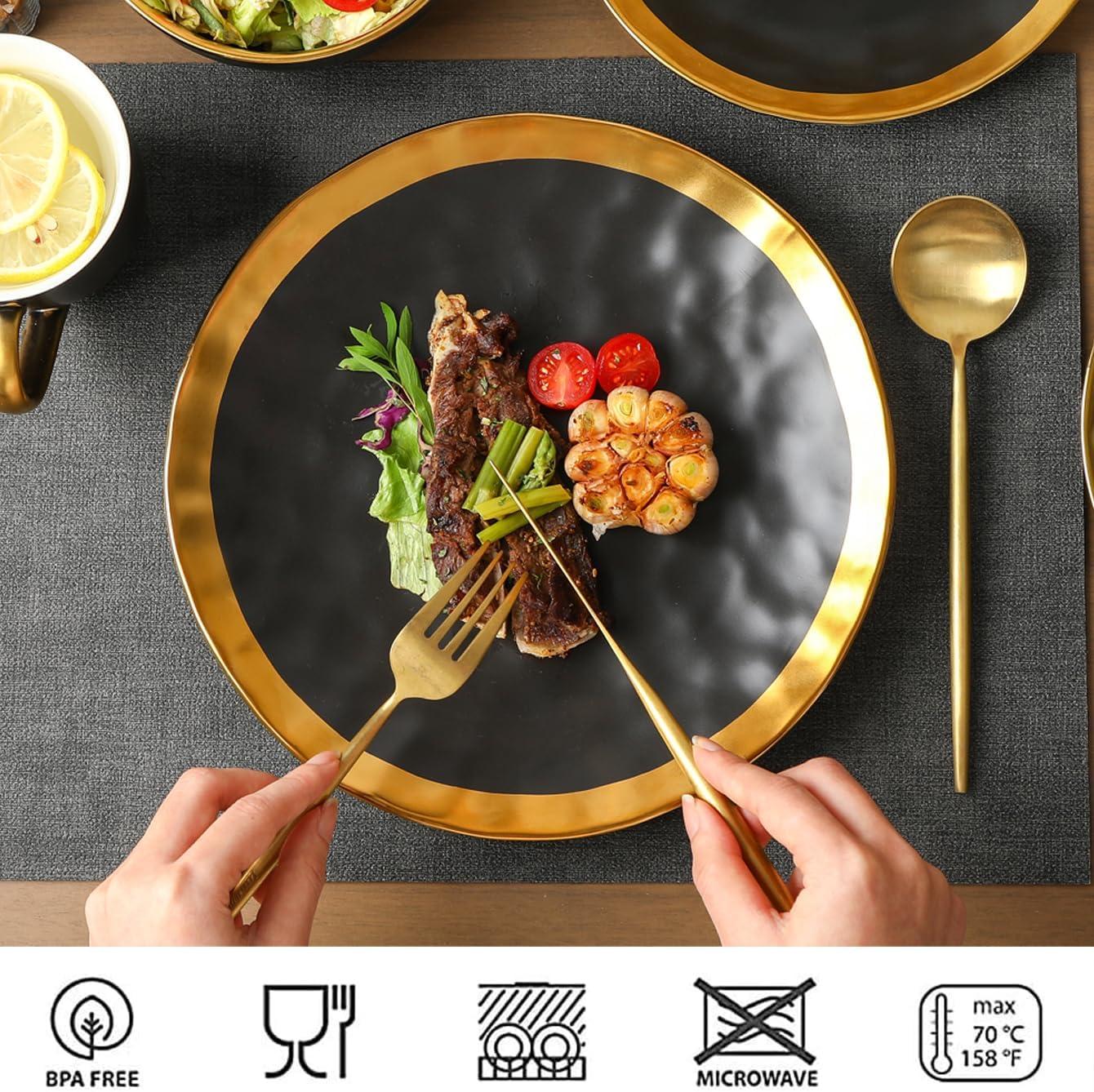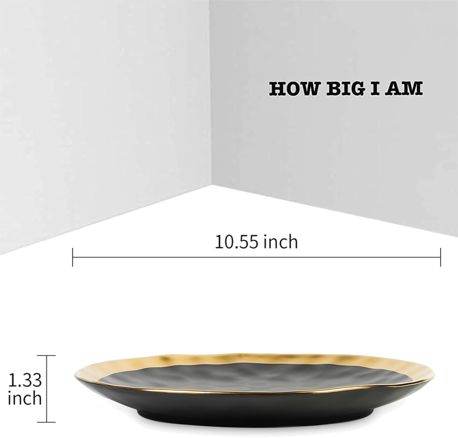 vicrays Ceramic Round Plates Set of 6 – Porcelain 10 inch Dinner Plates for Salad Dessert Appetizer Bread – Microwave Oven and Dishwasher Safe – Blue(Black with Golden)